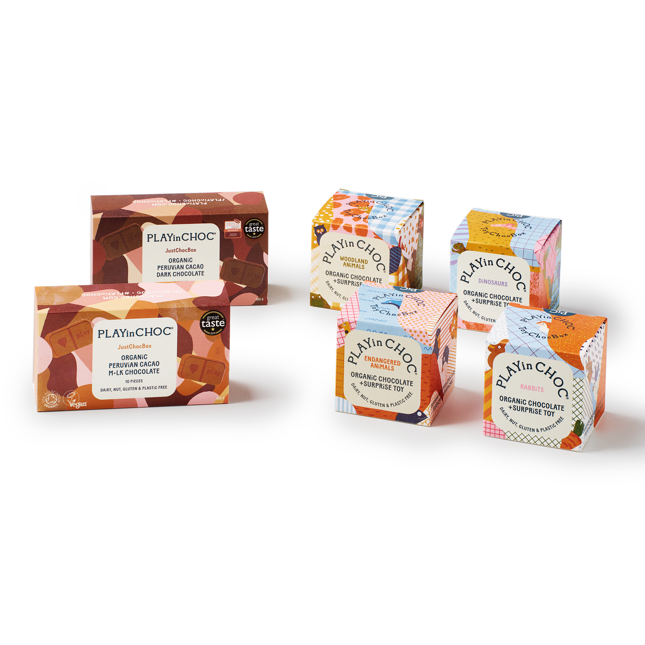Each ToyChoc box contains two deliciously creamy pieces of our award-winning chocolate along with a cardboard designed toy animal to be assembled and a fun facts card to learn all about your new friend.