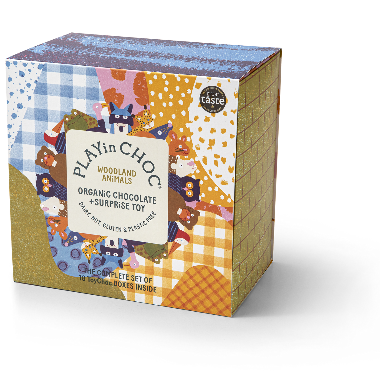 All eighteen ToyChoc Boxes® from the Woodland Animals collection in one boxed set. The outer sleeve can also be opened up into a landscape to play with all 18 toys.