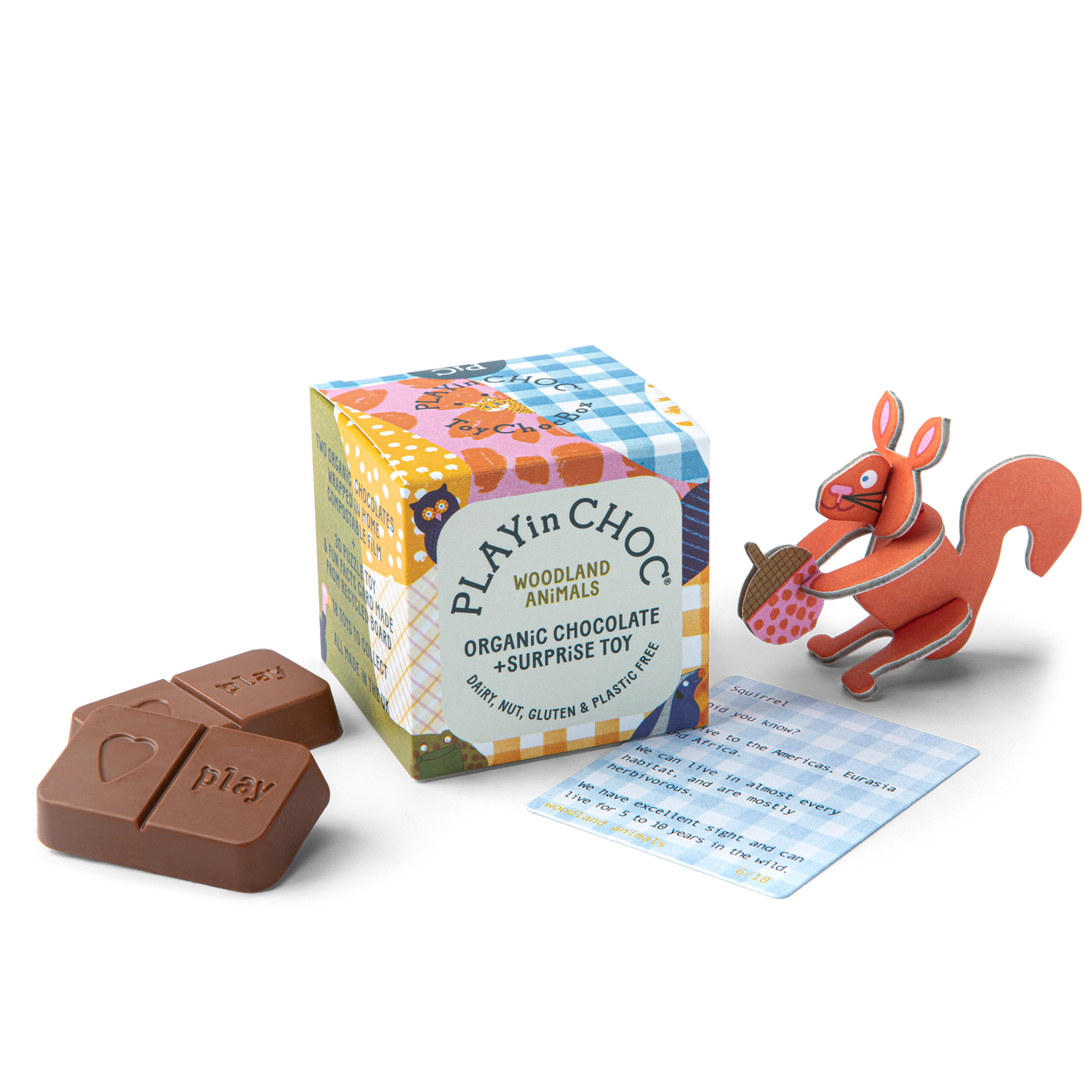 Each PLAYin CHOC® ToyChoc Box® contains two individually wrapped, deliciously creamy, organic, dairy-free chocolates, a 3D cardboard puzzle toy to assemble and a fun facts card.