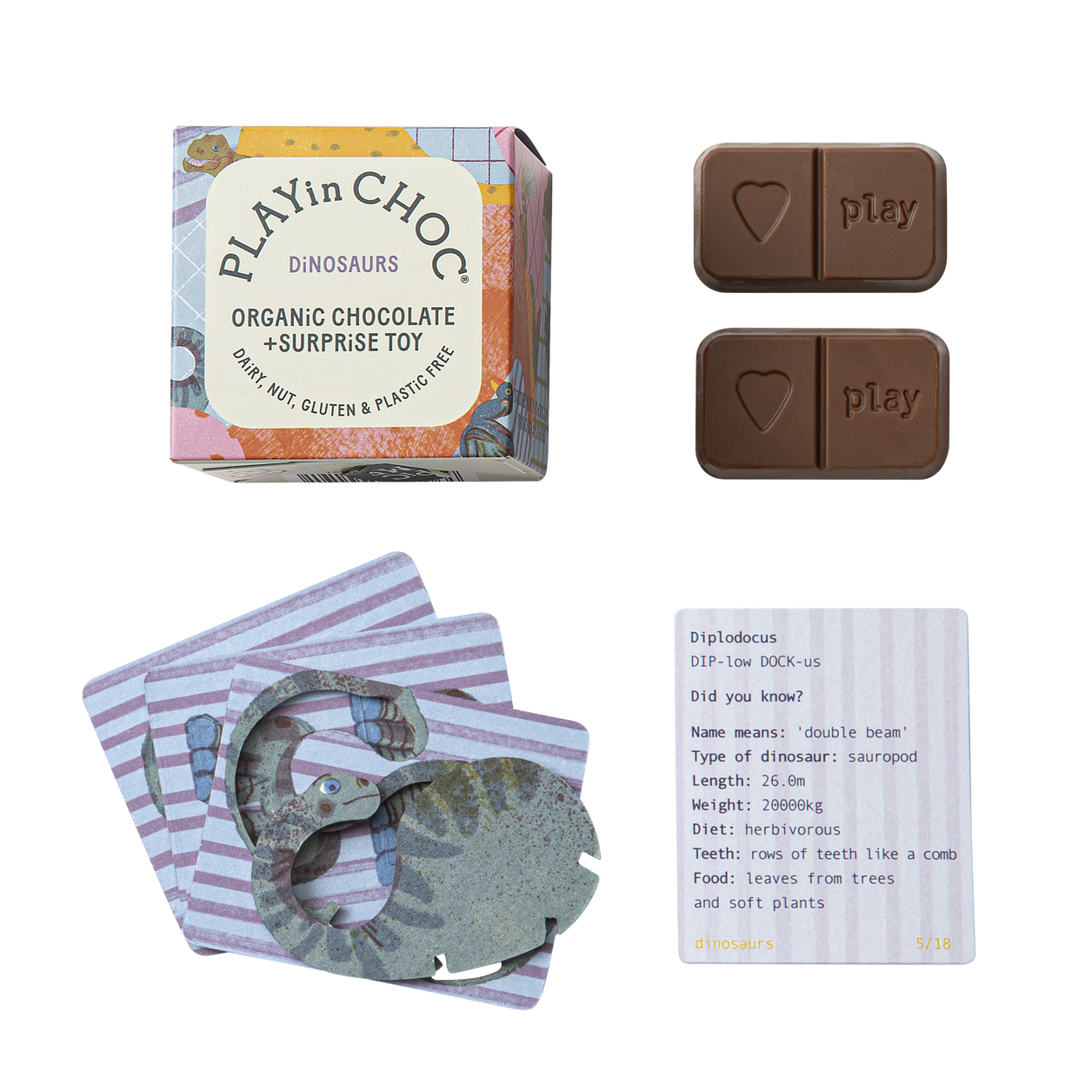 Each PLAYin CHOC® ToyChoc Box® contains two individually wrapped, deliciously creamy, organic, dairy-free chocolates, a 3D cardboard puzzle toy to assemble and a fun facts card.